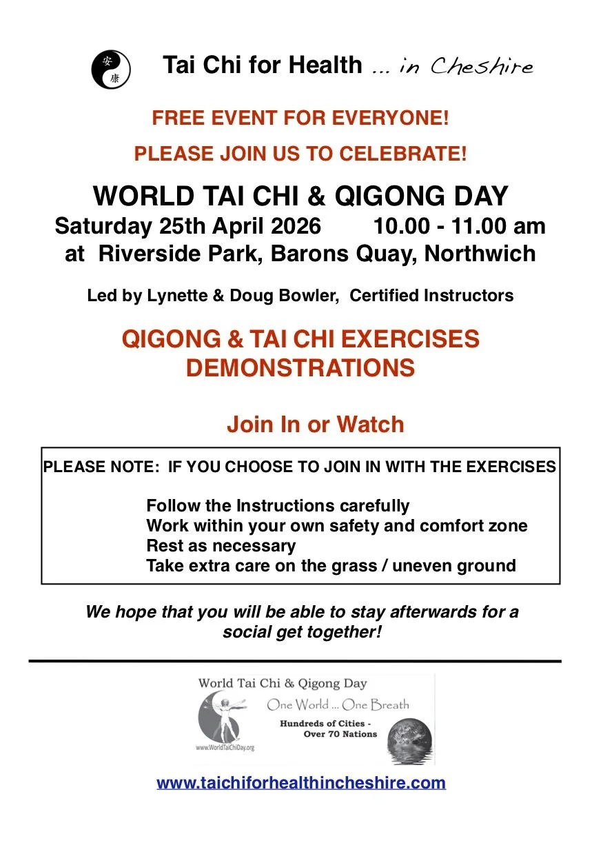As always, we’ll be celebrating World Tai Chi & Qigong Day, which will once again take place at Baron’s Quay in Northwich on Saturday 25th April (see the poster below). We look forward to seeing many of you there!